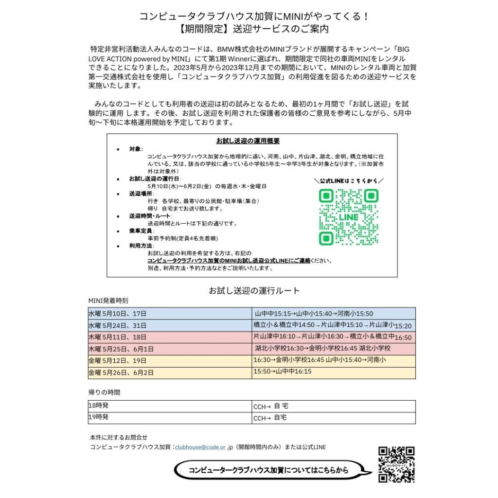この度、「コンピュータクラブハウス加賀」を運営するNPO法人みんなのコードは、2023年5月から2023年12月までの期間において、MINIのレンタル車両を使用し「コンピュータクラブハウス加賀」の利用促進を図るための送迎サービスを実施いたします。