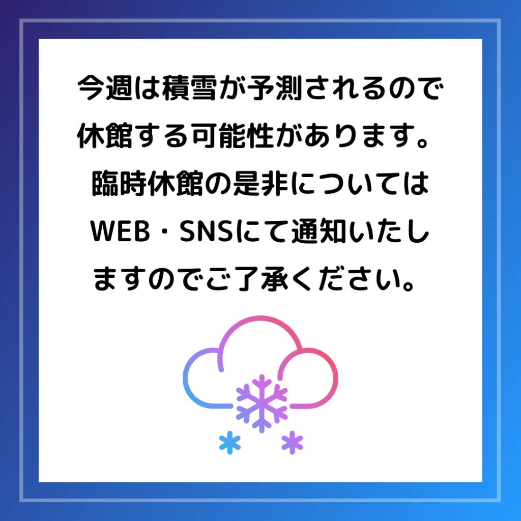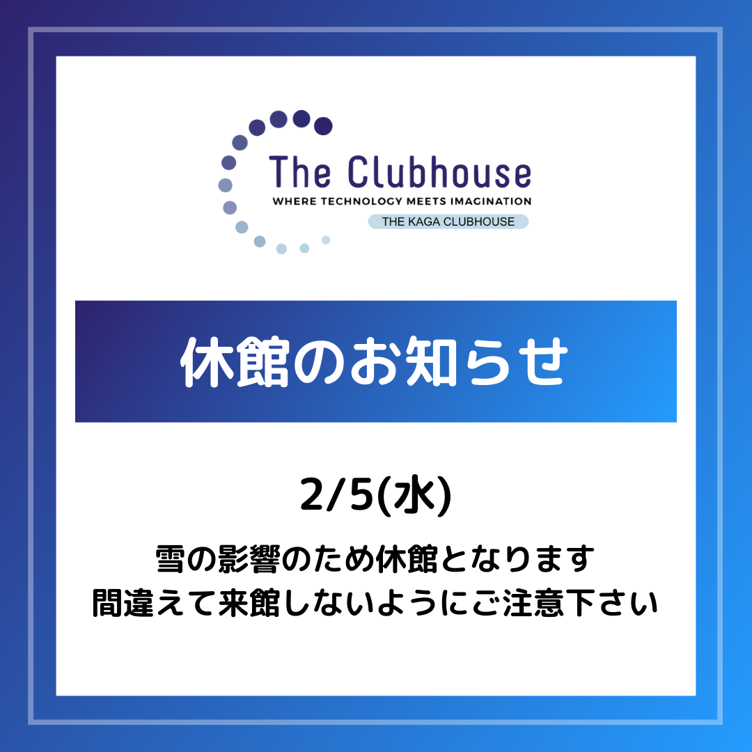 明日2/5(水) は雪の影響のためコンピュータクラブハウス加賀を休館とさせていただきます。間違えて来館しないようご注意ください😭 利用者の皆様にはご不便をおかけいたしますが、ご了承いただけますようお願い致します。